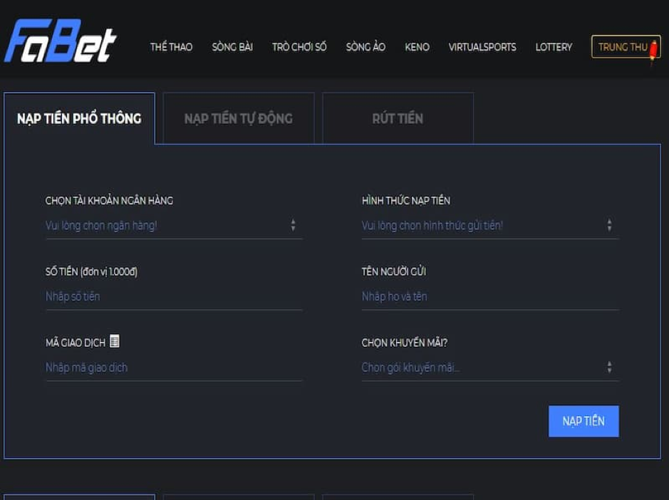 Mọi thủ tục giao dịch đổi thưởng tại nhà cái Fabet đều được thực hiện một cách nhanh gọn. Nhà cái cho phép người chơi nạp tiền vào tài khoản bằng nhiều hình thức khác nhau.